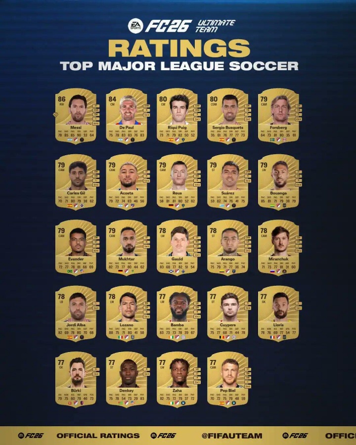 9月3日最新消息,FC26官方发布美职联球员能力榜单,梅西以86分高居榜首!德保罗以84分位列第二。